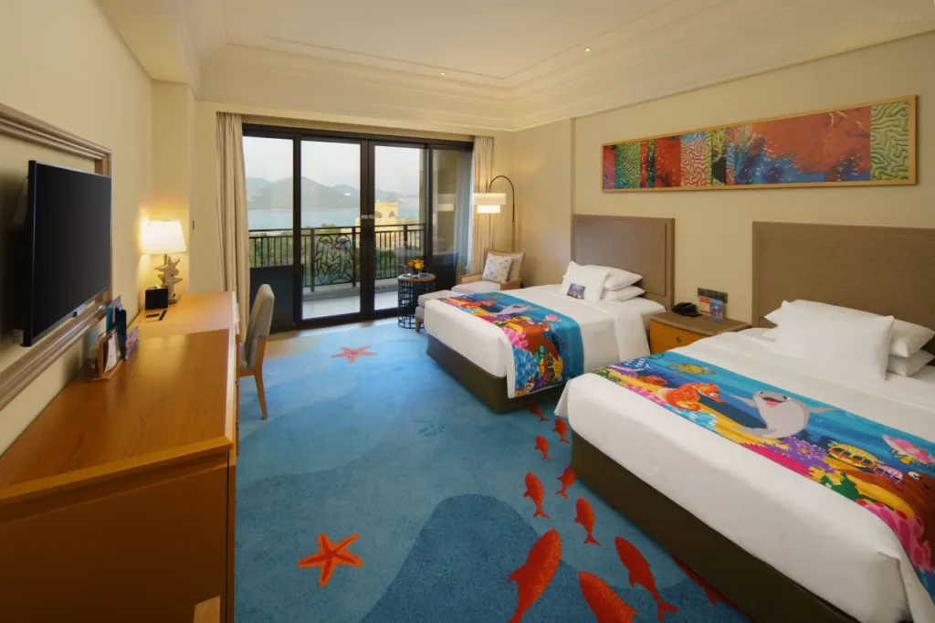 - Marine Explorer Rooms: Dive into an underwater fantasy with whale shark murals, coral-inspired décor, soft blue lighting, and bunk beds shaped like submarines. Perfect for kids who dream of ocean adventures—especially after a day at Chimelong Ocean Kingdom.